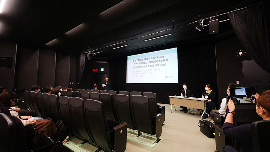 産業デザイン学科3年選択必修の「デザイン計画および同実習B-1a:映像」の実習授業において、仙台市自転車交通安全課と連携して制作した自転車利用時のルール・マナー遵守を促す動画の成果発表会が、2023年6月6日(火)せんだいメディアテーク7階スタジオシアターを会場に開催しました。