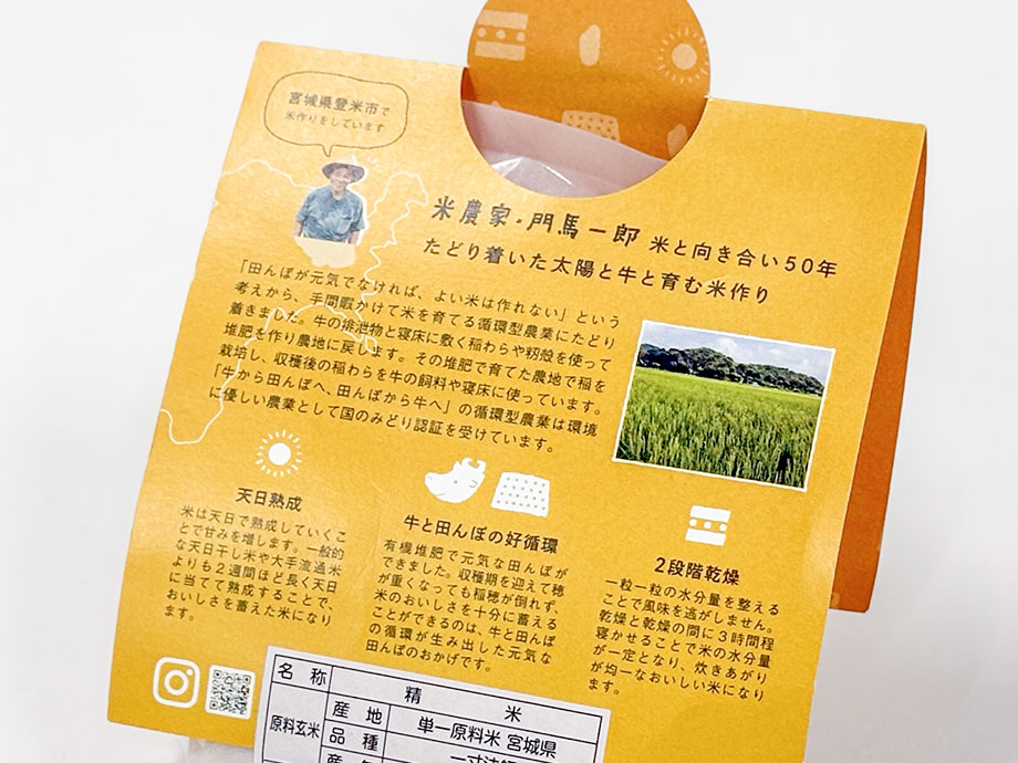 合同会社一源で生産しているお米の特徴(天日熟成・牛と田んぼの好循環・2段階乾燥)をわかりやすくパッケージに取り入れました。