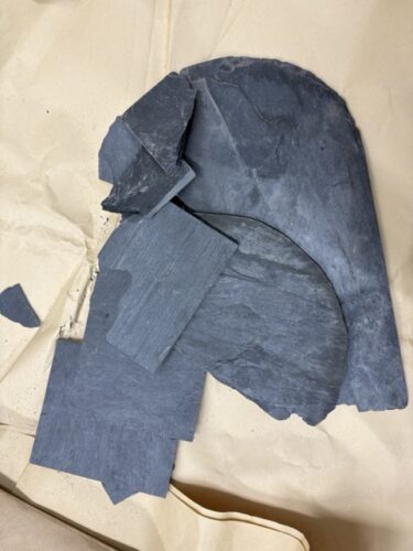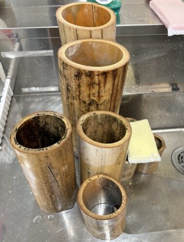 楽器の素材となった学内の竹と、他研究室から提供頂いたスレート(石材)。素材の質感を活かした制作を目指した。