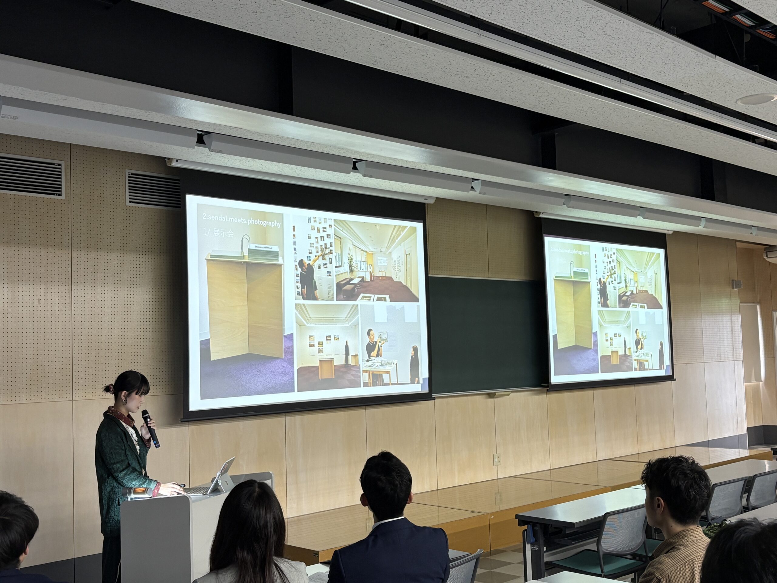 この日は、年に一度、教職員全員で東北工業大学のブランドについて深く考える日として設けられています。その共有の場において、生活デザイン学科4年の藤井 瑠杏さんが、これまでの学びと実践について発表を行いました。